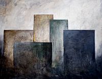 Een abstract schilderij waarbij er hoop gloort achter de horizon. De verbinding tussen de objecten heeft een serene rustgevende uitstraling.