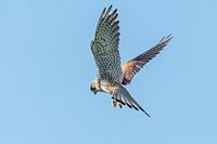 Een torenvalk biddend in de lucht, jagend op een prooi in de Allier, Frankrijk