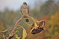 Torenvalk in de tuin op een uitgebloeide zonnebloem