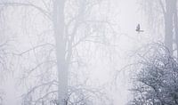Een torenvalk in vlucht, prachtig gefotografeerd in haar omgeving. Dit vrouwtje vliegt op uit de meidoorn om op jacht te gaan. De compositie van de bomen in de achtergrond werkt mooi mee en laat de leefomgeving van de torenvalk zo goed zien. De mist maakt de foto af.