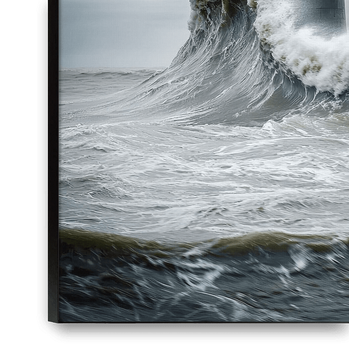 Een imposante vuurtoren rijst dapper op uit de woeste golven, een stille schildwacht die de onstuitbare woede van de oceaan trotseert. De golven beuken met onstuitbare kracht tegen de stenen gevel, alsof ze hem proberen op te slokken. Maar de toren blijft standvastig, een symbool van volharding en weerstand. De turbulente zee eromheen…