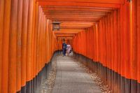 Een verliefd koppel loopt in traditionele Japanse kleding onder de prachtige torii (bogen) door in het heiligdom Fushimi Inari-taisha in de wijk Fushimi-ku van de Japanse stad Kyoto. Een ongekende hoeveelheid van duizenden knalrode torii (poorten) baant hier een pad door een prachtig groen gebied. Ze vormen een surrealistisch beeld en zorgen voor een prachtige ervaring wanneer je door deze halfopen tunnel wandelt.