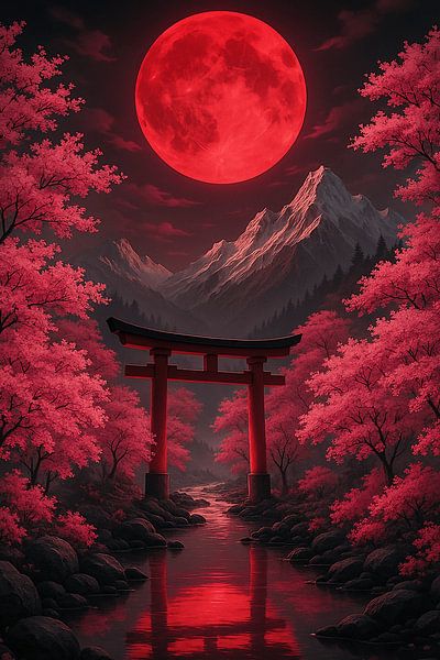 Dit mystieke kunstwerk verbeeldt een traditionele Japanse torii poort omringd door levendige kersenbloesems en een rivier die de gloeiende rode maan weerspiegelt. Een surrealistische fusie van vrede, kracht en oude symboliek.