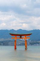 Oranje houten torii poort in de zee bij het eiland Miyajima dicht bij Hiroshima in Japan. Het bouw werk in het oranje heeft een mooi contrast met de bewolkte blauw achtige achtergrond en water.