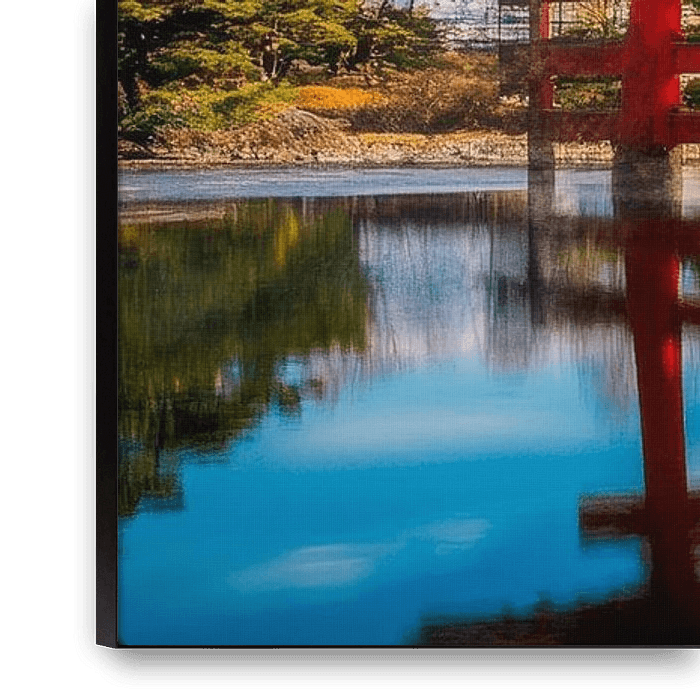 Een majestueus berglandschap met de glinsterende Fuji op de achtergrond en een felrode torii die weerspiegelt in het water roept een vredige en harmonieuze sfeer op. Dit indrukwekkende decor is perfect voor de woonkamer, waar het de harten van je gasten zal raken met een vleugje Japanse elegantie en rust.