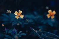 Tormentil is een prachtig klein plantje met 4 gele, hartjesvormige bloemblaadjes. De blaadjes zijn groen maar reflecteren veelal blauw in het licht. Een leuk detail is het paars in de foto. Aan elke punt van de blaadjes zitten hele kleine paars of roze puntjes.