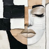 Close-up collage portret van een vrouw in gebroken wit,beige,zwart en naturel bruin tinten.