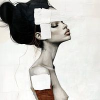 Modern abstract collage portret van een stoere vrouw met gescheurd papier,touw en illustratie elementen in gebroken wit,beige,zwart en steenrood tinten.