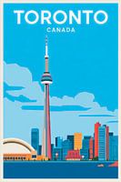 De iconische CN Tower rijst majestueus op boven de levendige skyline van Toronto met een stralende hemel als achtergrond. Kleurrijke wolkenkrabbers weerspiegelen de levendige energie van de stad, terwijl de zachte rimpelingen van het water op de voorgrond harmonie en beweging brengen. Dit uitnodigende en dynamische beeld belichaamt het hart van een culturele smeltkroes.