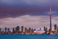 Na zonsondergang gezien vanaf de Toronto Islands in de avond als de lichten van de stad fonkelen is het uitzicht richting de stad en de skyline van Toronto met de CN Tower en Rogers Centre is werkelijk een must see.