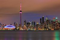 Na zonsondergang, tijdens de schemering, het uitzicht vanaf de Toronto Islands richting de richting de stad en de skyline van Toronto met de CN Tower en Rogers Centre.