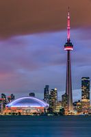 Na zonsondergang, tijdens de schemering, het uitzicht vanaf de Toronto Islands richting de richting de stad en de skyline van Toronto met de CN Tower en Rogers Centre.