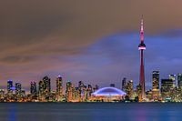 Na zonsondergang, tijdens de schemering, het uitzicht vanaf de Toronto Islands richting de stad en de skyline van Toronto met de CN Tower en Rogers Centre.
