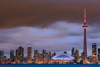Na zonsondergang, tijdens de schemering, het uitzicht vanaf de Toronto Islands richting de richting de stad en de skyline van Toronto met de CN Tower en Rogers Centre.