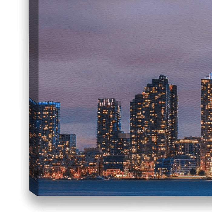 Na zonsondergang, tijdens de schemering, het uitzicht vanaf de Toronto Islands richting de richting de stad en de skyline van Toronto met de CN Tower en Rogers Centre.