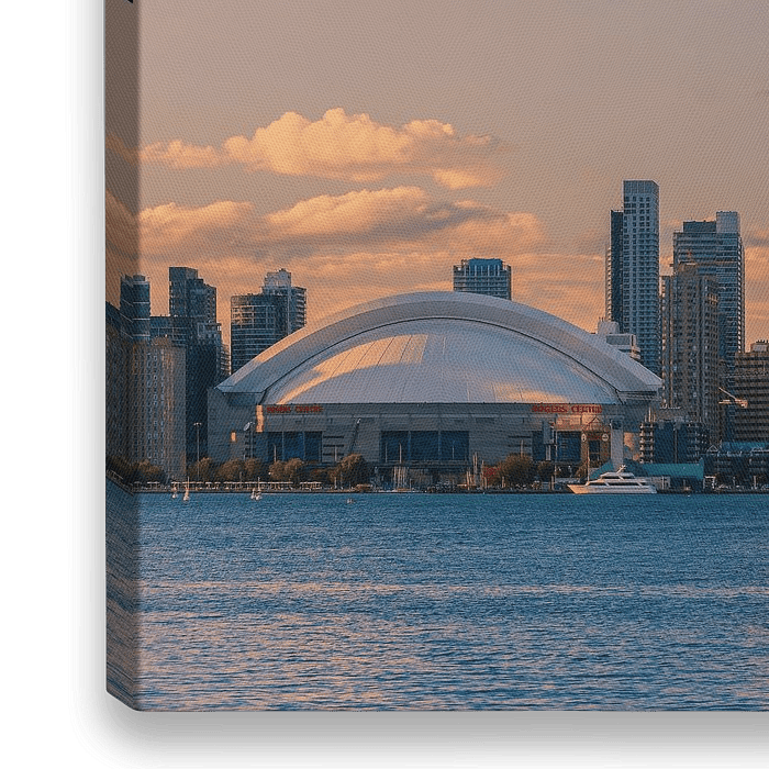Zonsondergang, en het uitzicht vanaf de Toronto Islands richting de richting de stad en de skyline van Toronto met de CN Tower en Rogers Centre.