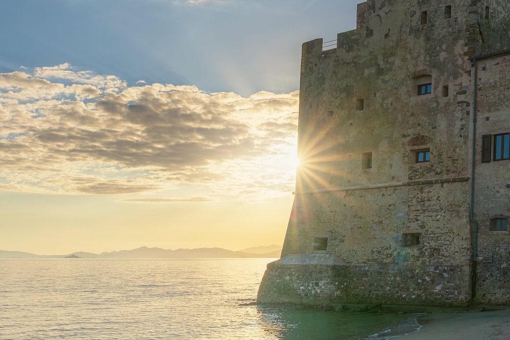 Torre Mozza strand en een oud gebouw aan zee. Follonica, Provincie Grosseto, regio Toscane, Italië