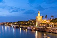 Aan de oever van de Guadalquivir met de historische wachttoren Torre del Oro bij avondschemering, Sevilla, Andalusië, Spanje | Oever van de Guadalquivir en de historische wachttoren Torre del Oro bij avondschemering, Sevilla, Andalusië, Spanje