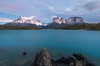 Torres del Paine weerspiegelt zich in het kalme water van Lake Pehoé tijdens het blauwe uur. De bergen rijzen krachtig op onder een diepblauwe lucht, terwijl de eerste ochtendlichten de contouren van het Patagonische landschap zacht accentueren. Een serene, bijna magische stilte vult de lucht, waar water, bergen en hemel elkaar perfect…