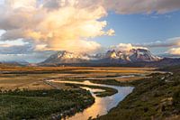 Deze foto vangt het magische moment van het gouden uur bij Torres del Paine, gezien vanaf Rio Serrano. Het warme, zachte zonlicht transformeert de imposante bergtoppen en de rivier tot een serene, bijna dromerige compositie. Het spel van licht en schaduw benadrukt de ruige schoonheid van Patagonië en nodigt de kijker uit om even stil te…