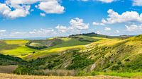 Een groot panorama beeld van een landschap in Toscane. In het hart van Italië prijkt Toscane met haar adembenemende landschappen. Golvende heuvels bedekt met eindeloze wijngaarden, oude olijfgaarden en schilderachtige cipressen. Charmante dorpjes met geplaveide straatjes nestelen zich tussen glooiende valleien. Het landschap van Toscane betovert met haar tijdloze schoonheid en wekt de ziel tot leven. Betoverend Toscane: Glooiende heuvels, cipressen en wijngaarden.