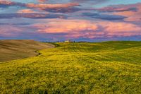 Een Toscaans landhuis bij zonsondergang in de Val d'Orcia ten zuiden van Siena.