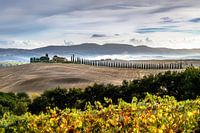 Typisch Toscaans landschap met zacht glooiende heuvels en velden.