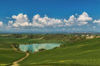 Toscaans landschap met een meertje met Siena in de verte op de achtergrond.