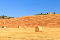 Prachtig typisch Toscaans gouden landschap met hooibalen en een landhuis in de zomer