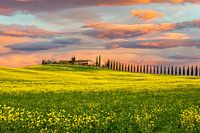 Toscaans landschap met koolzaad op de voorgrond.