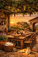Dit kunstwerk toont een sfeervolle buitenscène waarin een lange houten eettafel centraal staat, gedekt voor een warme, gezellige maaltijd in de buitenlucht in Toscane. Op de tafel staan borden, glazen rode wijn, brood, fruit en brandende kaarsen die een intieme en uitnodigende sfeer creëren. Boven de tafel hangt een pergola vol…