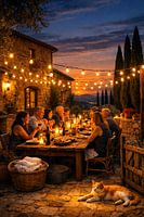 Dit kunstwerk toont een warme en sfeervolle buitenscène in Toscane waarin een groep mensen samen dineert aan een rustieke houten tafel, omringd door zachte verlichting en het gouden licht van de ondergaande zon. De tafel is rijk gedekt met borden, glazen, flessen wijn en diverse gerechten, wat een gevoel van gezelligheid en samenzijn…