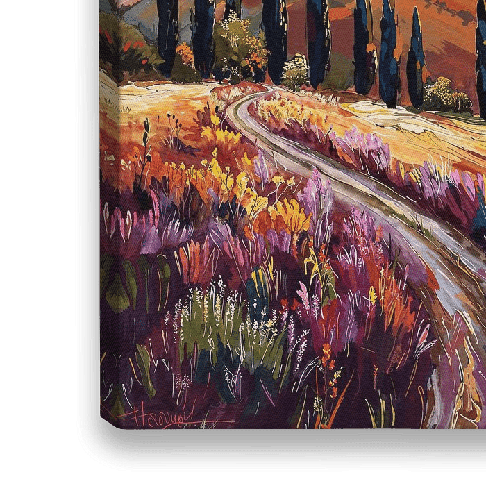 "Toscaanse Zomerzon" is geïnspireerd door de betoverende landschappen van Toscane, Italië. De kunstenaar heeft de serene schoonheid van de glooiende heuvels, de karakteristieke cipressen en de warme kleuren van een zonsondergang vastgelegd. Het schilderij weerspiegelt de rustige en tijdloze sfeer van het Toscaanse platteland, waar elke bocht van de weg een nieuw adembenemend uitzicht biedt. De felle paarse en gele tinten in de lucht en de weelderige velden van wilde bloemen geven het werk een dynamisch en levendig gevoel, dat de rijke en kleurrijke cultuur van de regio viert.