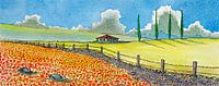 Toscaanse heuvellandschap met klaprozen | Aquarel schilderij van WatercolorWall