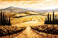 Dit prachtige ontwerp toont een idyllisch Toscaanse landschap, waar de zon de glooiende heuvels en wijngaarden in warme sepia-tinten baadt. Met zijn rustieke charme brengt dit schilderij direct een serene sfeer in uw interieur. Perfect voor liefhebbers van klassieke en natuurlijke elementen, zal dit stuk uw woonkamer, eetkamer of zelfs kantoor verfraaien. De rijke kleuren en subtiele details maken het een tijdloos stuk dat een warme, uitnodigende uitstraling geeft. Ideaal om een vleugje Toscaanse elegantie in huis te halen.