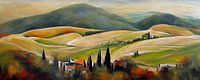 Dit werk vangt de serene en idyllische sfeer van het Toscaanse landschap in Italië. Met zachte kleuren en een rustgevende compositie brengt het de schoonheid van glooiende heuvels, wijngaarden en cipressen tot leven. Het schilderachtige tafereel straalt rust en harmonie uit, en roept het gevoel op van een zomerse dag op het Italiaanse platteland.