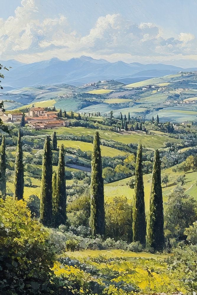 Toscane | Through Time's Window - Dit landschapsschilderij toont een idyllisch Toscaans uitzicht door een verweerde stenen muuropening, met glooiende heuvels, rijen cipressen, en verspreide gele bloemen.