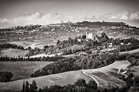 De foto toont een uitzicht op het dorp Montegemoli, ingebed in het typische landschap van de Val di Cecina. Op de achtergrond rijst het silhouet van Volterra op.