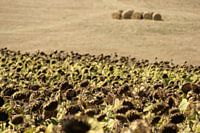 Een typisch Toscaans beeld. Het glooiende heuvellandschap, gebruind door de Italiaanse zomerzon. Het stro ligt te drogen in grote ronde balen. Op de voorgrond laten de zonnebloemen hun hoofden hangen in de verzengende hitte.