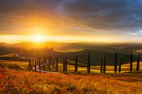 Het dromerige Toscaanse landschap wordt heel even gekust door het gouden licht van de ondergaande zon.