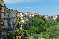 Het mooi gelegen middeleeuwse San Miniato in Toscane in Italië. Mooie gekleurde huisjes op de rand van een heuvel kijken mooi het Toscaanse landschap in. Hoe Italiaans wil je het krijgen.