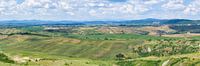 Een groot panorama beeld van een landschap in Toscane. In het hart van Italië prijkt Toscane met haar adembenemende landschappen. Golvende heuvels bedekt met eindeloze wijngaarden, oude olijfgaarden en schilderachtige cipressen. Charmante dorpjes met geplaveide straatjes nestelen zich tussen glooiende valleien. Het landschap van Toscane betovert met haar tijdloze schoonheid en wekt de ziel tot leven. Betoverend Toscane: Glooiende heuvels, cipressen en wijngaarden. Het is hier een groot XXL bestand dus eventueel zelf aan te passen.