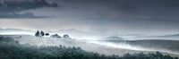 De mist ligt nog steeds mystiek in de valleien van de heuvels, weiden en velden.