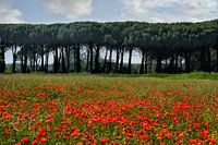 Toskana-Impression einr Landstrasse, die von Pinien gesäumt an einem prächtigen Mohnblumenfeld vorbeiführt