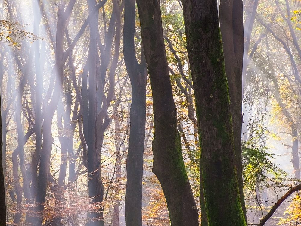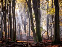 Mistige herfstochtend in een dik bos met het zonlicht dat door de bomen schijnt.