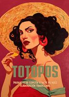Een kunstdruk in vintage stijl van een Latino meisje met een sombrero op haar hoofd dat een tortillachip eet. De titel is "Totopos", de Mexicaanse naam voor tortillachips.