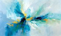 Fantasie abstract in voornamelijk wit,groen en blauw tinten met goud accenten.