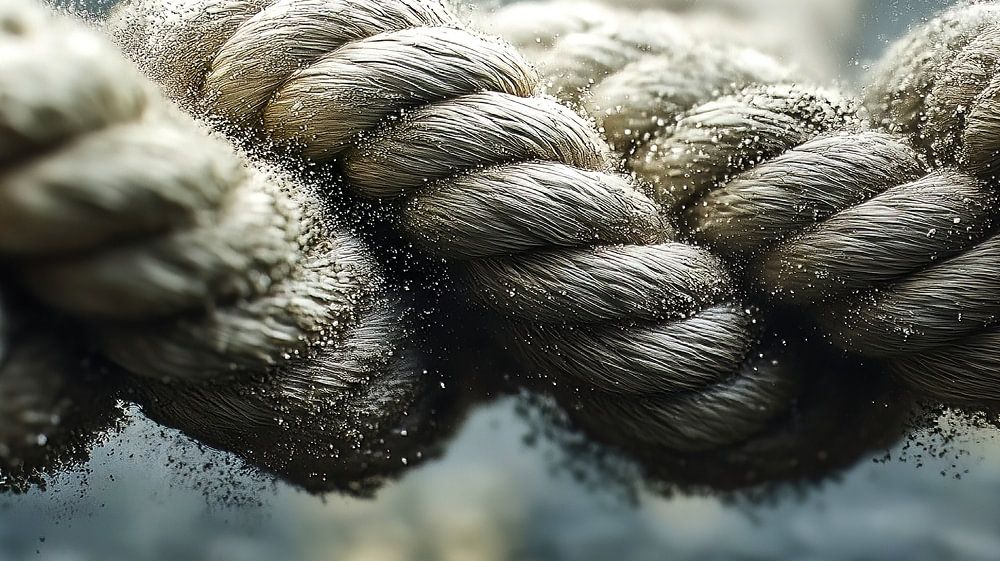 Close-up van een touw onder spanning dat langzaam rafelt en stofdeeltjes loslaat. Symboliseert kracht, spanning en veerkracht op momenten van grote spanning.