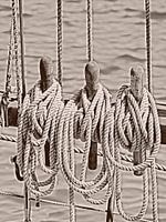 Spijkerbank en tuigage op een oude houten zeilboot, sepia getint om de look van een oude foto te creëren.
