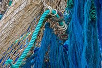 In de haven van Scheveningen zag ik een vissersboot. Ik werd getroffen door de prachtige kleur blauw van de visnetten. Ook de structuren van de materialen spraken me aan. Een mooie kleurige plaat voor aan de muur.